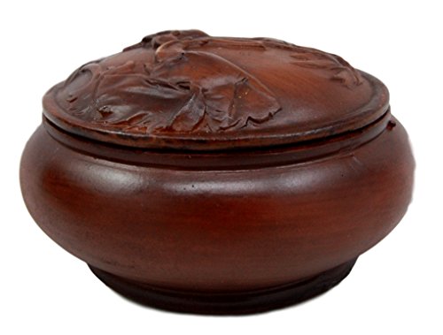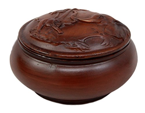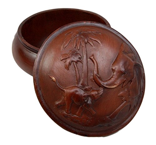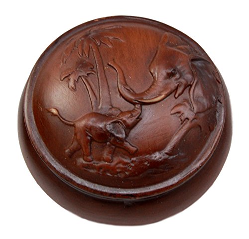 Look for a rustic and exotic jewelry holder or other knick knack holder? This rounded faux wood resin box will do the job perfectly!!! On its surface is a carving of a Safari Elephant with its calf.