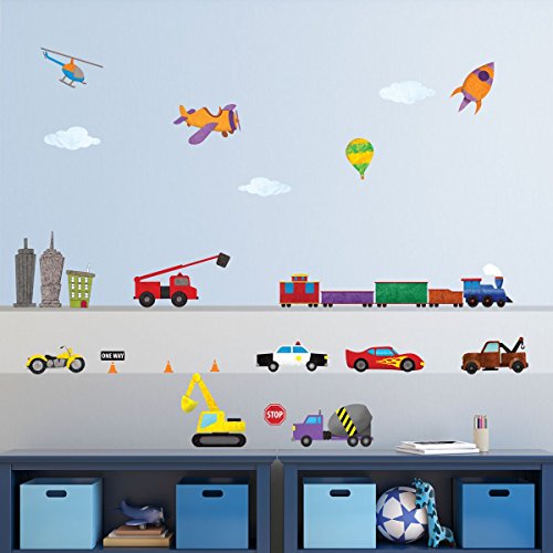 -. Feature : A COMPLETE SET OF TRANSPORTATION WALL DECALS FOR YOUR KIDS ROOM OR NURSERY: Fill the walls of your child's room with these colorful and fun decals. The full kit is jam-packed with 27 great designs including the following wall decals: fire truck, 5-piece train, airplane, helicopter, tow truck, cement mixer, police car, race car, motorcycle, excavator sticker, hot air balloon, rocket ship, stop sign, one way sign, construction cones, buildings and clouds. / TOP QUALITY & ULTRA EASY TO PUT UP: So fabulous! So easy! Just peel and stick for an instant room makeover. These decals are made from an innovative fabric wall sticker material that is super easy to put up and can be repositioned. No tools needed! No fuss! And when you are ready to change your wall décor, the stickers can be easily removed and won't leave any sticky residue or damage your walls. / SUPERIOR DESIGN: These stickers are superior in so many ways! They truly look hand-painted and have no white outlines or harsh edges. And, unlike many of the mainstream transportation and construction decals out there, this design has a timeless appearance that will give your child years of amusement. With such a wide variety of transportation decals, you can create a full wall mural from top to bottom! / SAFE FOR KIDS: My Wonderful Walls decals are non-toxic and safe for kids, as they are free of harmful chemicals. These colorful wall graphics are loved by babies, toddlers and little kids alike. / MADE IN THE USA BY MY WONDERFUL WALLS: There is a lot of TLC poured into each and every product. The folks at My Wonderful Walls design and make these stickers in their studio in beautiful Chattanooga, Tennessee, USA. Most days, they even whistle while they work!