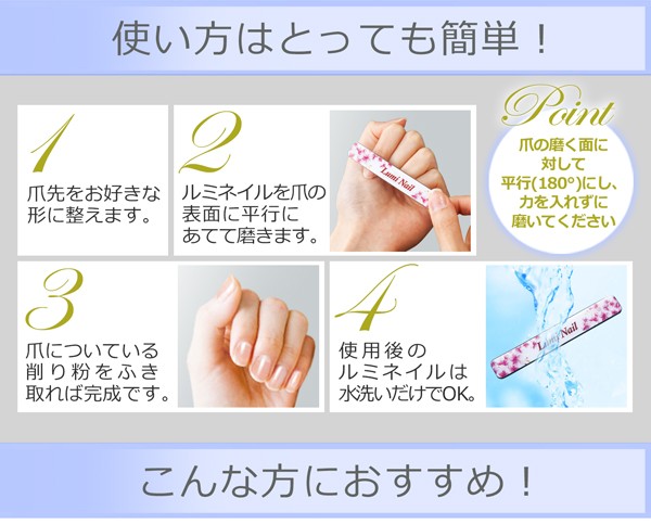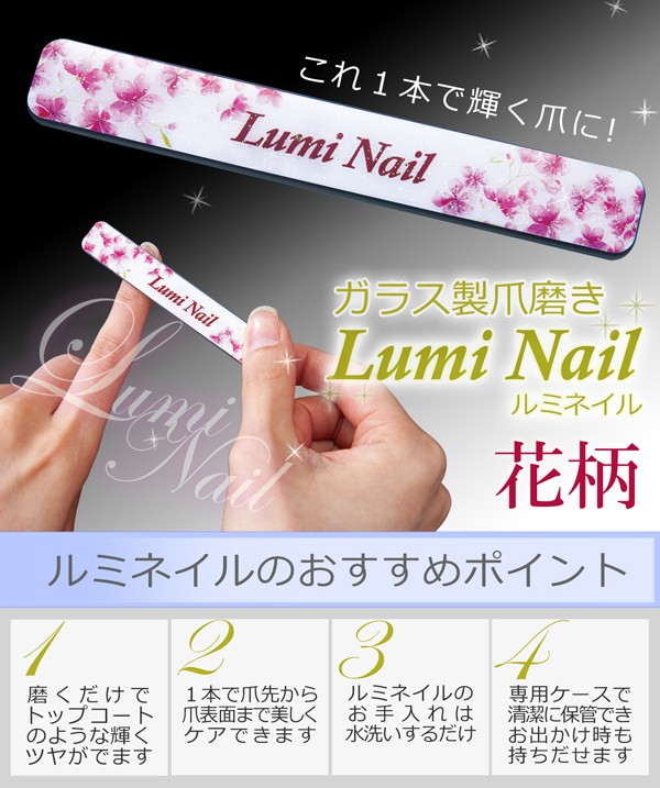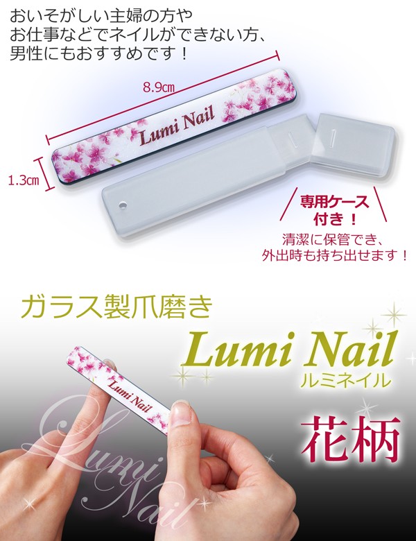 | 磨くだけでトップコートのような輝く爪に仕上がるガラス製爪磨きルミネイルに、花柄が新登場!これ1本で爪先から爪表面まで美しくケアできるアイテムです。毎日おいそがしい主婦の方や、お仕事でネイルができない方、そして男性にもおすすめです!お手入れは水洗いするだけでとっても簡単!専用ケース付で外出時も持ち出せます! |