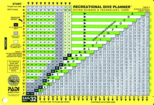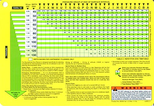 PADI Recreational Dive Planner for 32% Oxygen EAN for Scuba Divers