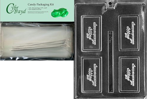 Cybrtrayd "Happy Anniversary" Business Card Chocolate Candy Mold with Packaging Bundle of 25 Cello Bags, 25 Silver Twist Ties and Chocolate Molding Instructions