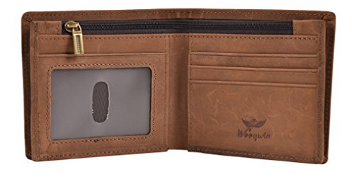-. Feature : Material: 100% Genuine Crazy Horse Leather, Durable and Lightweight. Eevry Man Will Like Genuine Leather Bifold Wallet. / Size: 4.72" x 3.35" (12 x 8.5 CM) / Measures: The Leather Wallet has 1 ID Window, 5 Card Slots, 2 Cash Pockets, 1 Zipper Pocket for coins,receipts, or tickets. / RFID Blocking Wallet: The Wallet Keeps Your Vital Information Secure, Safe and Protects Credit Cards, Debit Cards, Driver License and ID Cards from Electronic Pick Pocketing; Blocking all RFID Scanners and Readers. / Sales Support: I am Sure You Will Like our Wallet, But If Any Problem, Please Contact us Freely, We Will Solve It in Favor of Your Right, Replace or Full Refund.