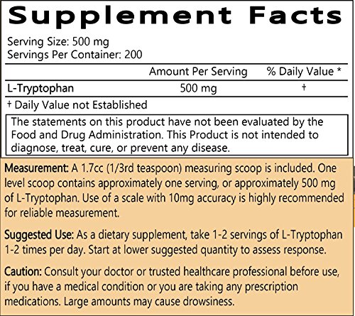 -. Feature : BOOSTS MOOD - L-Tryptophan Bulk Powder benefits include its wonderful ability to boost your mood through increasing serum serotonin levels / PROMOTES HEALTHY SLEEP AND RELAXATION - People use L-Tryptophan for sleep because of its ability to improve melatonin levels in your brain / GREAT HEALTH BENEFITS - Clinical studies have indicated that L-Tryptophan has numerous secondary health benefits and can be used safely for kids, dogs, and cats / 100% VEGAN AND VEGETARIAN FRIENDLY- This L-Tryptophan supplement contains no animal products whatsoever / NO ADDITIVES - Our 99+% Pure L-Tryptophan is free from additives, fillers, preservatives, lactose, and gluten. It is tested by independent 3rd party laboratories in the US and ships with a Certificate of Analysis to ensure the highest quality