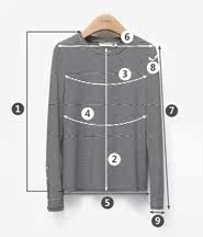 | 尺码 | ①前衣长 | ②后中长 | ③胸围 | ④腰围 | ⑤下摆围 | ⑥肩宽 | ⑦袖长 | ⑧袖臂围 | ⑨袖口围 | ||