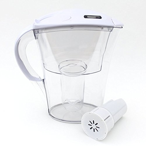 -. Feature : One 2 Liters (~13 cups) water filtration pitcher/jug with 1 Antioxidant Alkaline filters / Effectively reduces chlorine taste, odors, heavy metals (Lead, copper, cadmium, etc...), oxidation-reduction potential level, produces smaller water molecules and alkaline water / Water pitcher and filters are tested and certified by the Water Quality Association (WQA) / Each water filter can filter 40 gallons (150 liters) of water / Filter indicator for tracking when to change the water filter