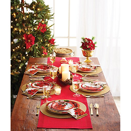 - Look for Golden Greenery tableware, Creative Converting Christmas decor and coordinating Touch of Color solids Classic Red and Glittering Gold