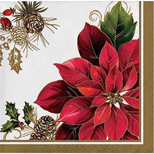 - White napkin with festive red poinsettia and gold accents