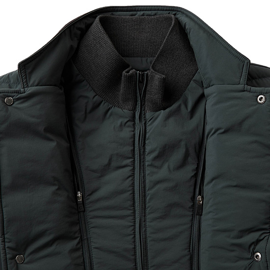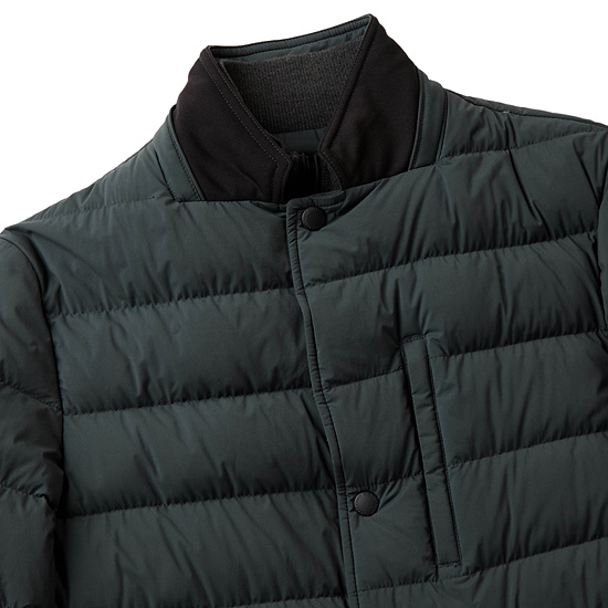 - 가로 퀼팅 조직으로 멋스러우며 네크라인 배색 컬러를 적용하여 디자인 포인트.