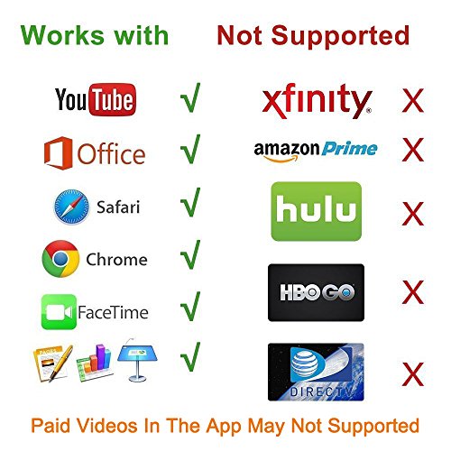 ATTENTION PLEASE: Not Compatible with Apps which have "HDCP" video copyrights protection like Netflix, Amazon video, HBO go, HULU and Honda motor. And Other Paid Videos In App May Not Supported. Support YouTube, Hulu Plus, IDMB, Quickflix, Family On TV, ABC, NBC, FOX, Microsoft Office and more videos.