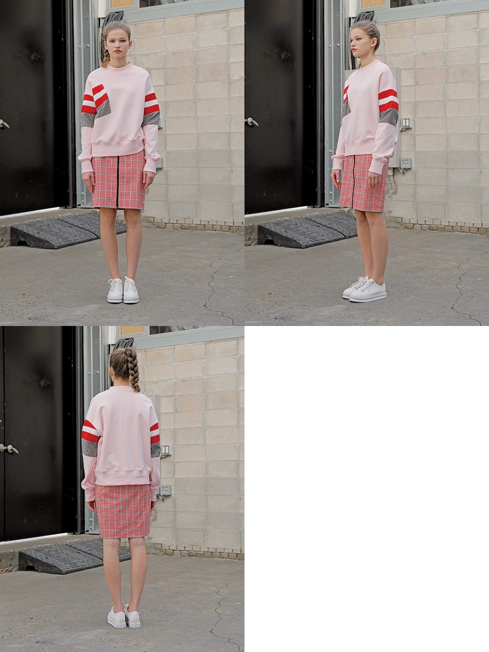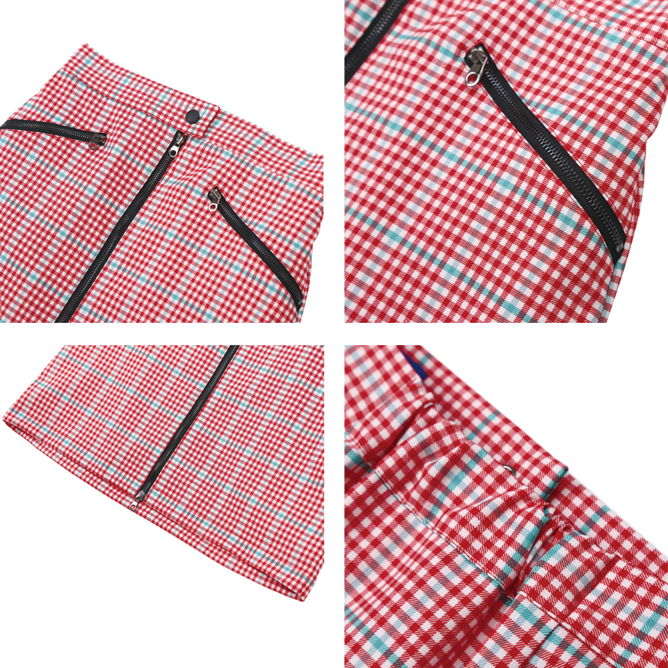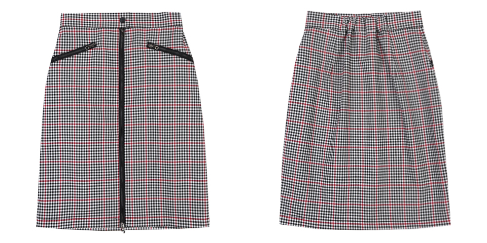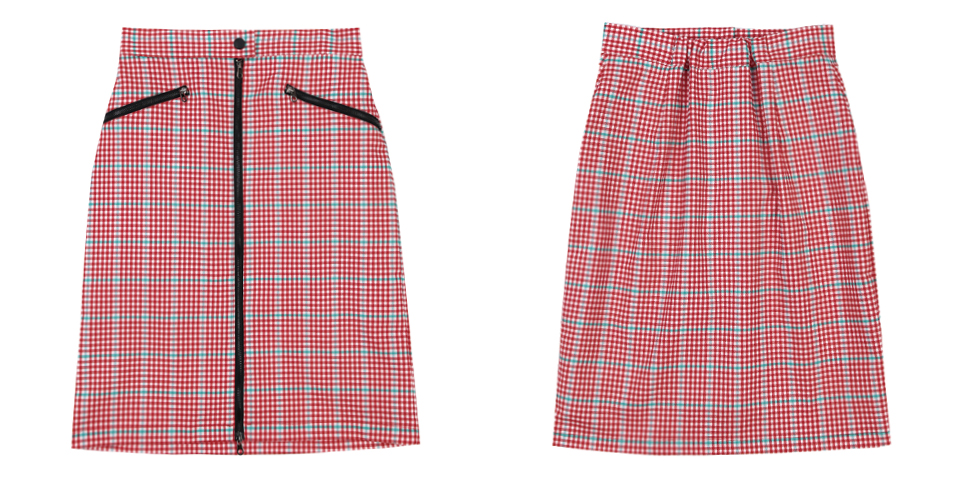 화사한 색감의 체크 패턴 스커트입니다. 스판 소재의 미디 기장 스커트로 앞 중심의 투웨이 배색 지퍼로 여미는 형태의 디자인입니다. 동일한 색상과 재질의 지퍼가 앞 주머니에 사선으로 들어가있습니다. 로고가 각인된 플라스틱 스냅 버튼이 장식되어 있으며 뒷판 허리에 엘라스틱 밴드를 트리밍하였습니다. 레드, 블랙 체크 두 가지 색상으로 출시되었습니다.