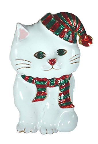 -. Title : Bejeweled Christmas White Cat Cap and Muffler Holiday Pin Brooch 322