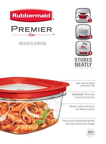 The Rubbermaid 12 Piece Premier Food Storage Set contains (2) 1.25 cup, (2) 2 cup, (1) 3 cup, and (1) 5 cup containers with lids. Rubbermaid Premier Containers are made with Tritan™ plastic that resists stains and odors. Plus, Premiers have Flex & Seal™ lids that are easy to seal and remove. Part of the Easy Find Lids system, Premier lids snap to bases and other lids so you will not have to search for lids again and nest together to take up less room in your cabinets. The crystal clear bases are perfect for easily seeing the contents of the container and the square shape allows for easy stacking and storage in the refrigerator. The new Rubbermaid Premier food storage containers are BPA free.