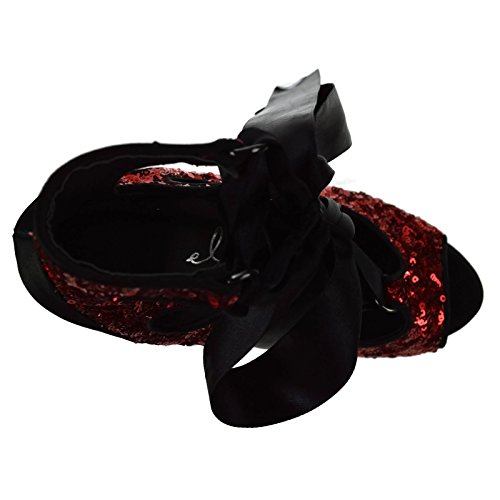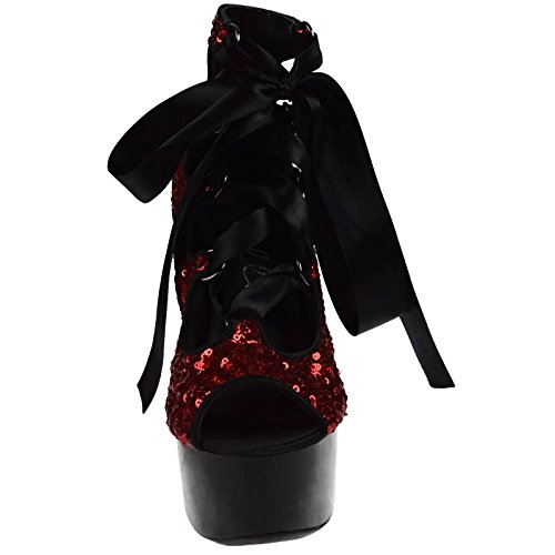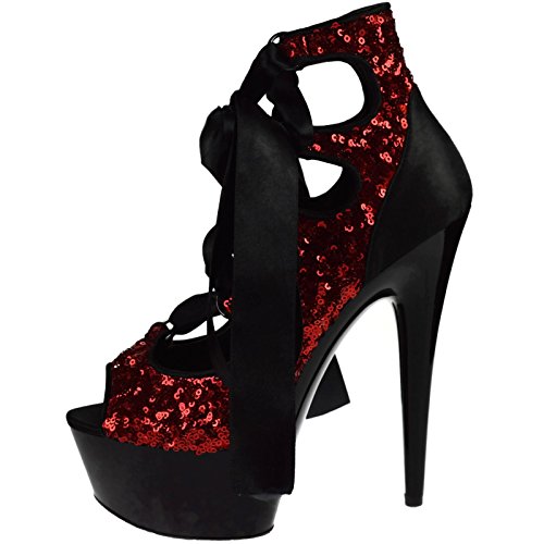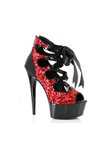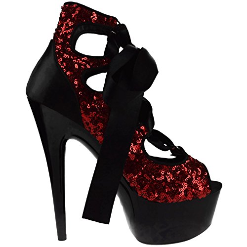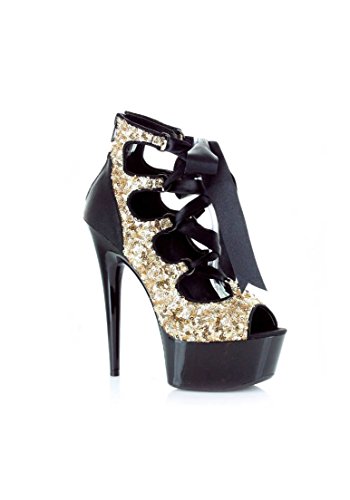 Product DescriptionPeep toe ankle high boot featuring open glitter covered vamp with ribbon lace up detail and zipper back on 2" platform and 6" stiletto heel.0