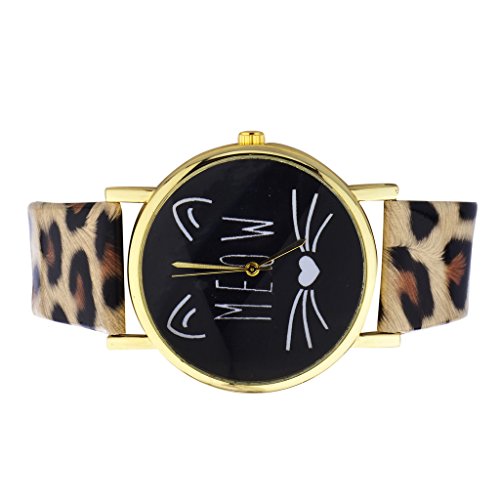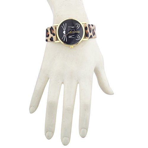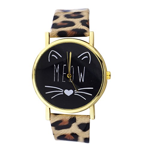 Lux Accessories Gold Tone Meow Cat Face and Leopard Pattern Watch Band Watch