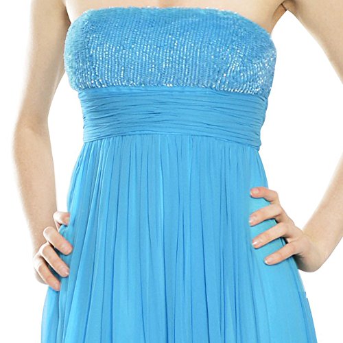 Heavenly ocean blue strapless evening gown. Lightly padded and boning supported bodice is layered with shimmering sequins. Defined pleated waistline opens into a full flowing silk chiffon skirt. Back zipper closure.