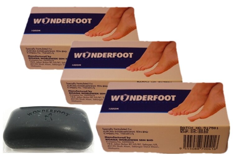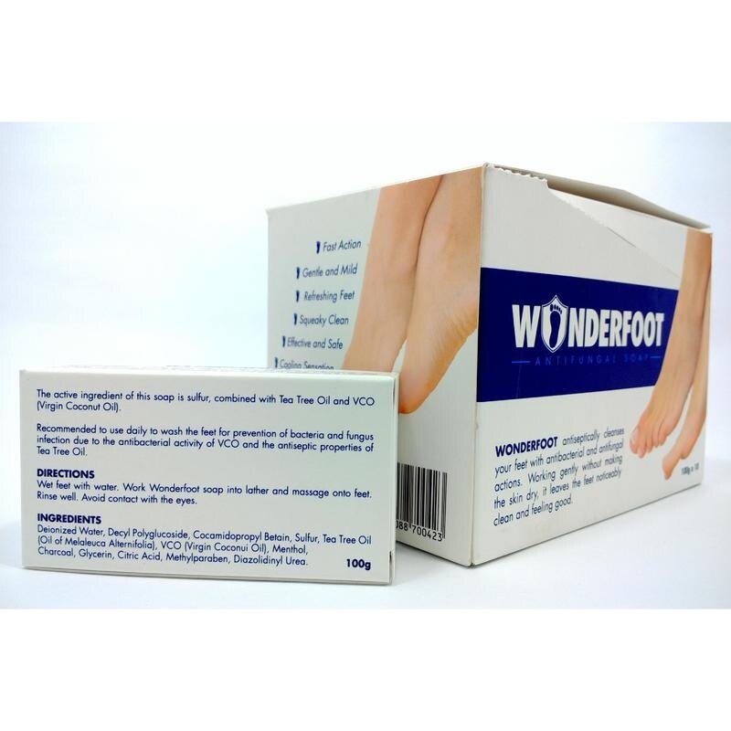 WONDERFOOT antiseptically cleanses your feet with antibacterial and antifungal actions. Working gently without making the skin dry, it leaves the feet noticeably clean and feeling good. Specially formulated using natural Tea Tree Oil for effective management of Athelete's foot and fungal infection of the feet The active ingredient of this soap is sulfur, combined with Tea Tree Oil and VCO (Virgin Coconut Oil).