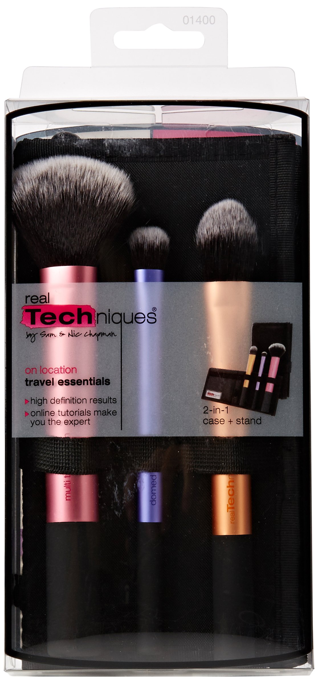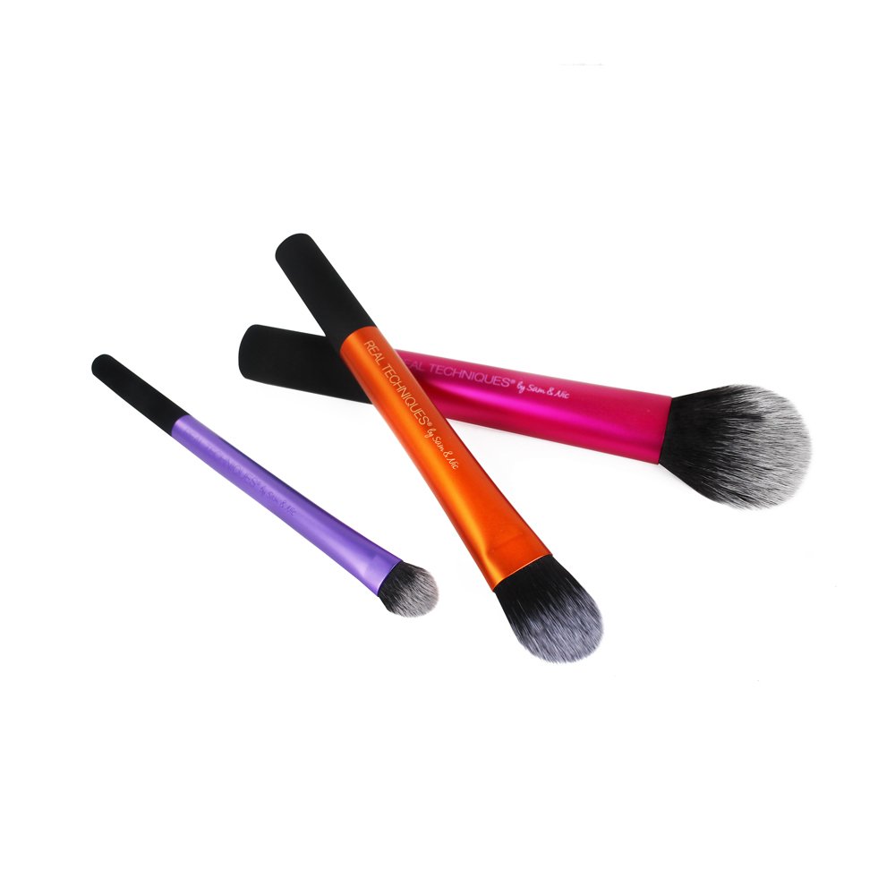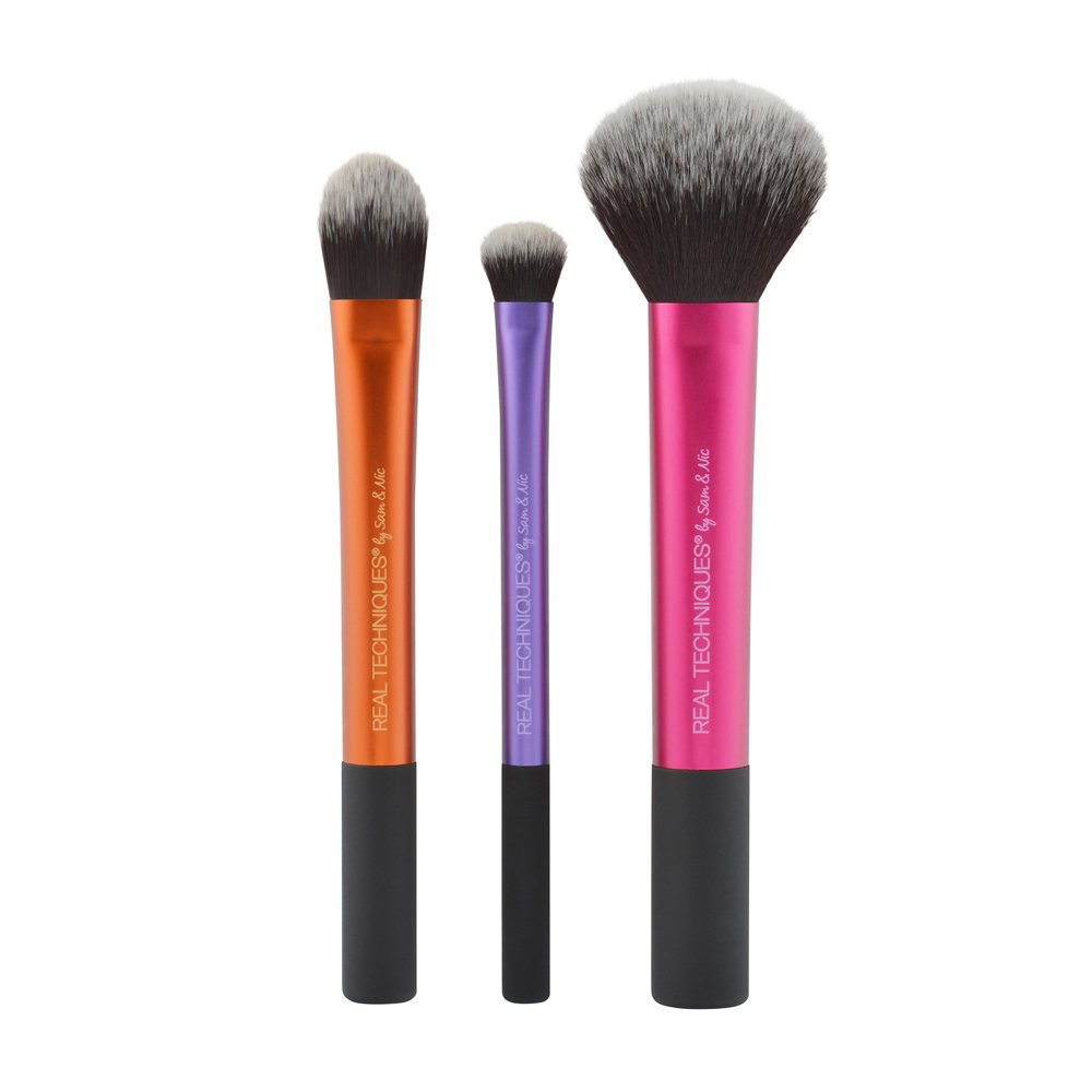 Real Techniques Travel Essentials Kit Including three must-have beauty makeup brushes that will help make create brush, the domed foundation brush, apply color to the cheeks or powder to the cheeks or soft to multi, soft multi task brush and finally add color or blend