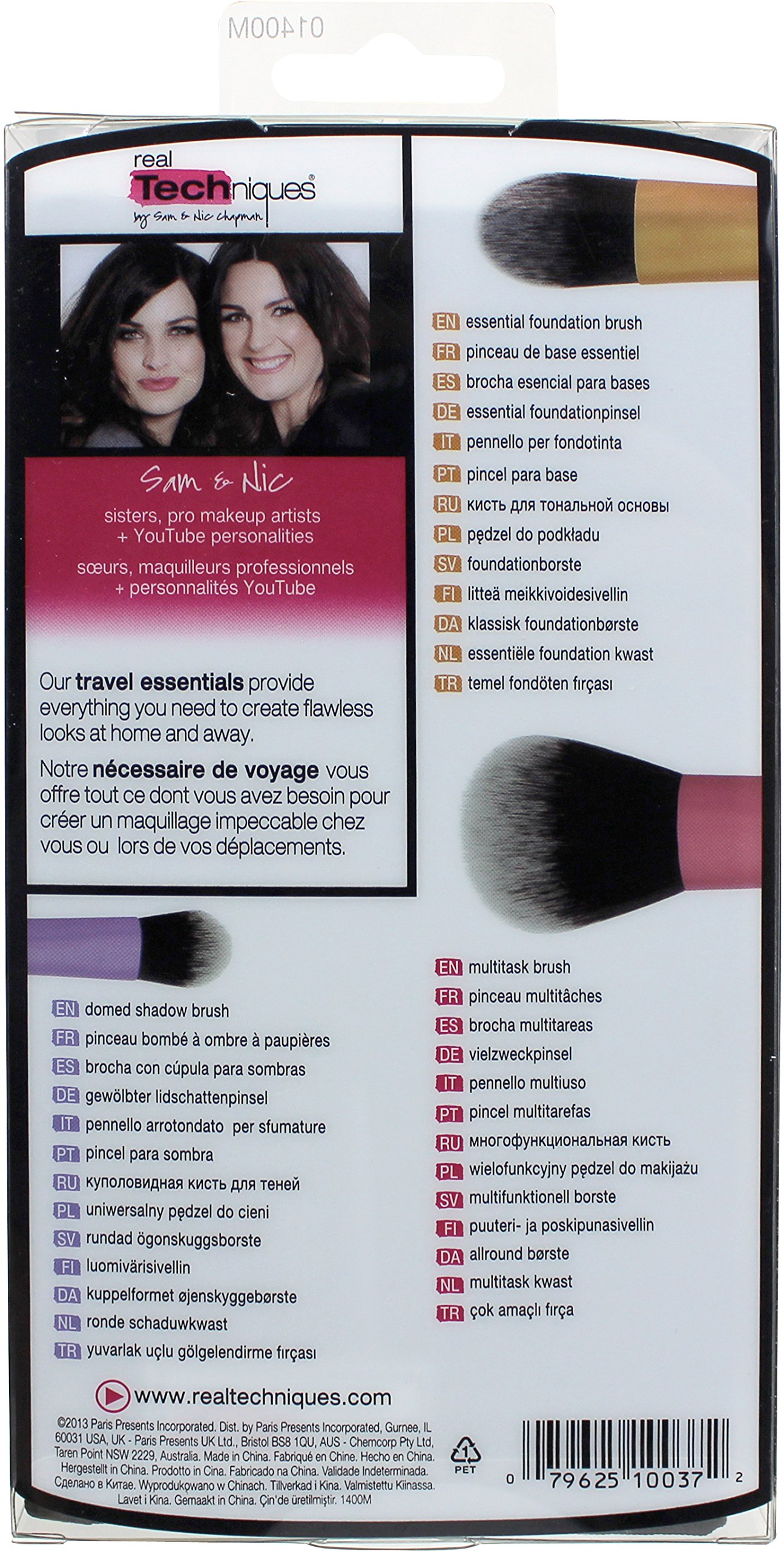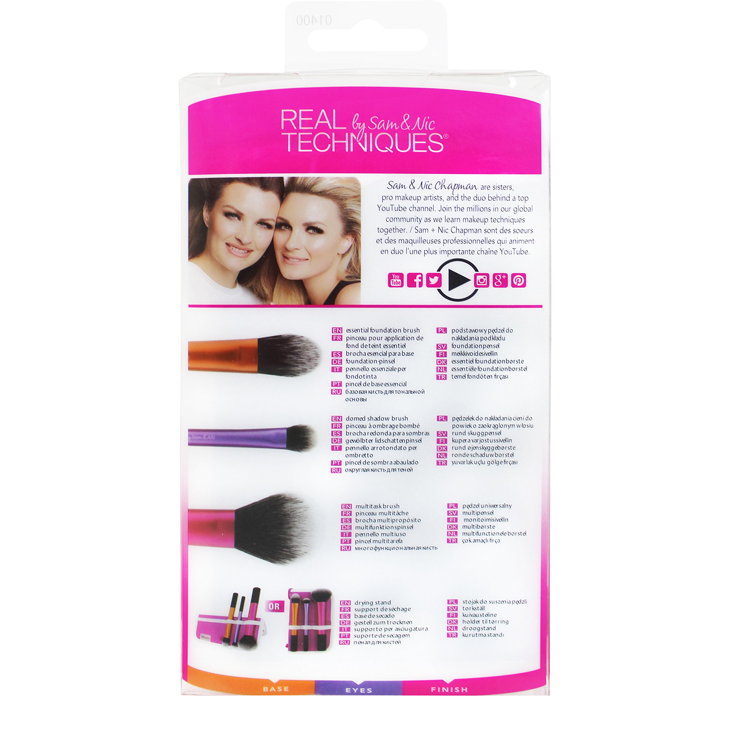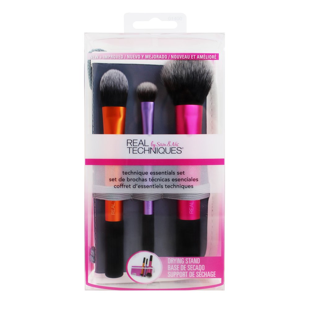 Real Techniques Travel Essentials Kit Including three must-have beauty makeup brushes that will help make create brush, the domed foundation brush, apply color to the cheeks or powder to the cheeks or soft to multi, soft multi task brush and finally add color or blend