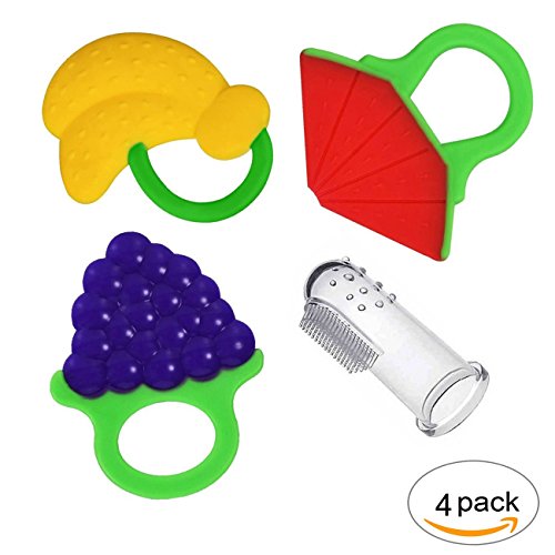 ★ 3 assorted Fruits teether with handle, and 1 finger toothbrush- Fun and colorful Watermelon Bananas and Grapes, Very captivating and great for sensory learning.
