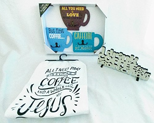 Jesus and Coffee Tea Towel and I Drink Coffee for Your Protection Word Art Sign by Primitives by Kathy with special bonus Coffee Cup Hook Set Exclusive Bundle - 3 pieces
