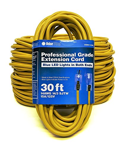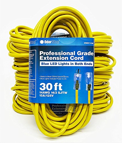 OdorStop OSEC1430 - 30' Yellow 14/3 SJTW Professional Grade Extension Cord with Blue LED Lighted Ends