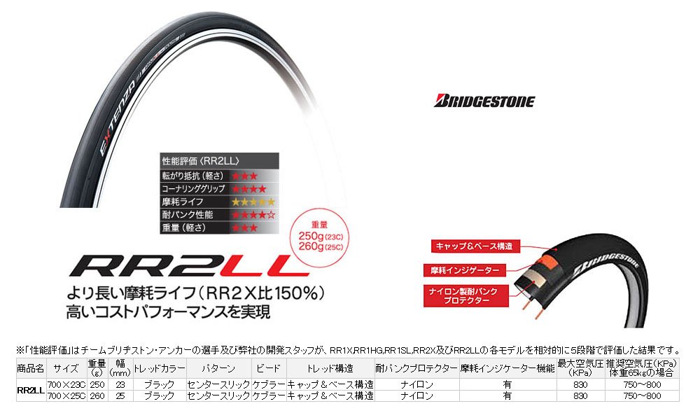 Product name Size Weight (g) Width (mm) Tread color pattern Bead tread structure Anti-puncture protector Wear indicator function Maximum air pressure (KPa) Recommended air pressure (KPa) For body weight 65 kg RR 2LL 700 × 23 C 250 23 Black center slick Kevlar cap &