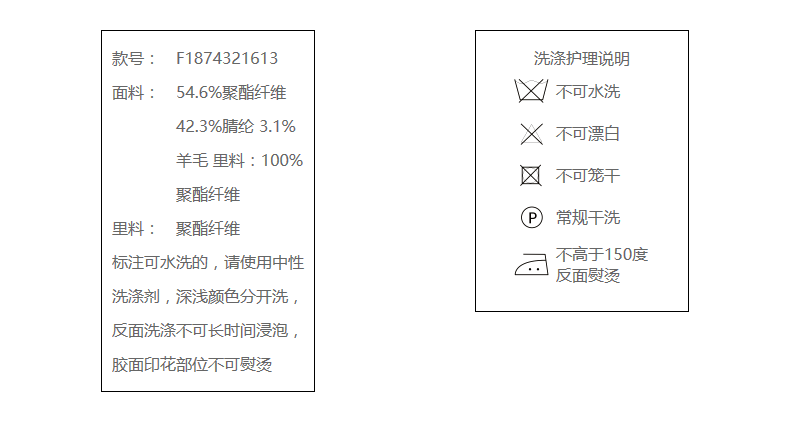 54.6%聚酯纤维 42.3%腈纶 3.1%羊毛 里料:100%聚酯纤维