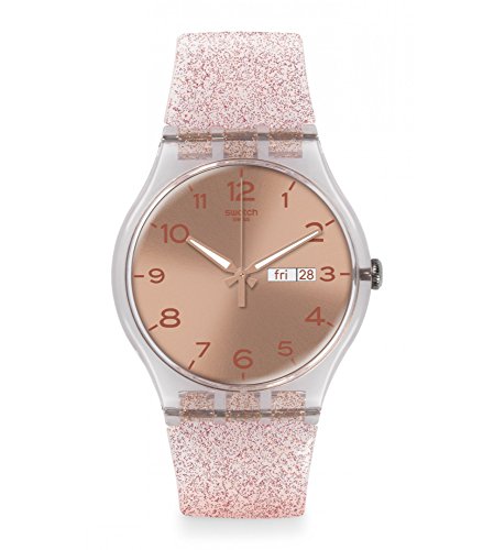 Transparent plastic case with a pink silicone strap. Fixed transparent plastic bezel. Pink gold dial with luminous pink gold-tone hands and Arabic numeral hour markers. Dial Type: Analog. Luminescent hands. Day of the week and date display at the 3 o'clock position. Quartz movement. Plastic crystal. Pull / push crown. Solid case back. Case diameter: 41 mm. Case thickness: 10 mm. Round case shape. Band width: 20 mm. Tang clasp. Water resistant at 30 meters / 100 feet. Functions: date, day, hour, minute, second. Casual watch style. Swatch Glistar Pink Gold Dial Pink Silicone Ladies Watch SUOK703.Feature