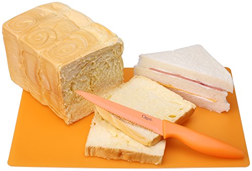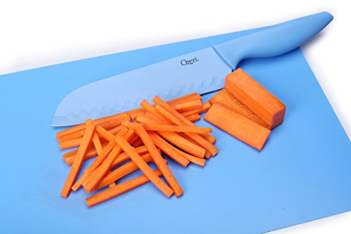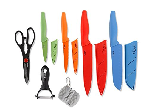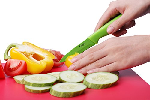 Features 4 stainless-steel knives with 4 FDA-approved non-stick colors - 8" Red Chef Knife, 7" Blue Santoku Knife, 5" Orange Utility Knife & 3.5" Green Paring Knife.