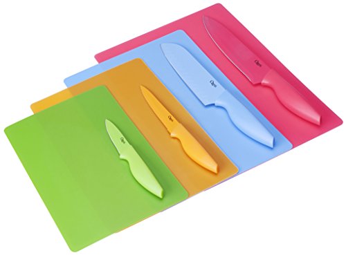 A necessity for the modern kitchen, the Elite Chef 12-Piece Stainless Steel Knife & Cutting Mat Set feature 4 stainless-steel knives with 4 FDA-approved non-stick colors that slice through almost anything with unmatched ease. The knives include an 8" Red Chef Knife, a 7" Blue Santoku Knife, a 5" Orange Utility Knife & a 3.5" Green Paring Knife. Coupled to 4 color-matching BPA-Free cutting mats in cascading sizes - Red 14" x 10", Blue 13" x 9", Orange 12" x 8", and Green 11" x 7", these stainless-steel knives feature perfectly balanced ergonomic handles and matching blade sheaths. The Elite Chef Stainless Steel Knives render a wide variety of cutting tasks effortless, from chopping, to mincing, slicing and dicing. These distinctively shaped knives utilize the highest quality stainless-steel that resist tarnishing and corrosion from long-term exposure to moisture, oils and acids in common foods. The 4 included BPA-Free cutting mats are color-coded to avoid cross-contamination in the kitchen, and uniquely feature non-slip EVA coated bottoms. The Elite Chef 12-Piece Stainless Steel Knife & Cutting Mat Set offers an all-in-one combination that is quintessential to the organized chef. Your satisfaction is 100% guaranteed.Feature