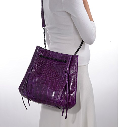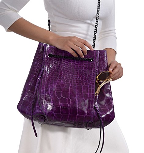 Croc embossed leather bag with top magnet closure merges the chic of a bucket to the practicality of tote. Pull chain accordion construction opens very wide to permit easy access.
