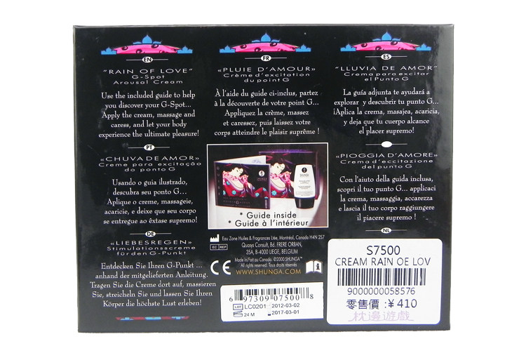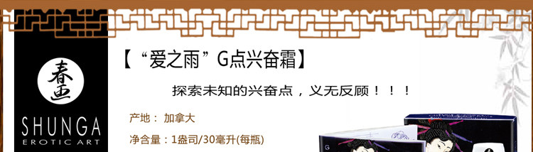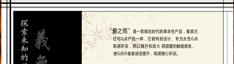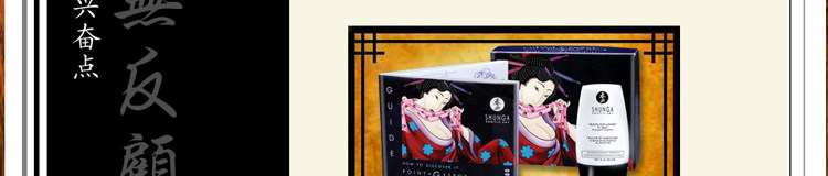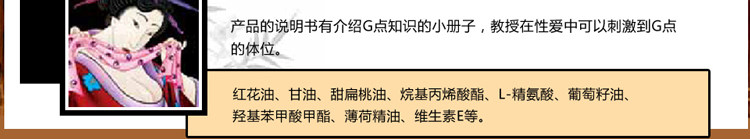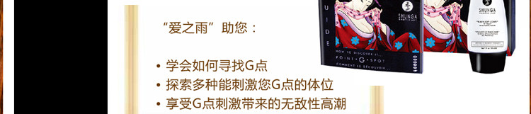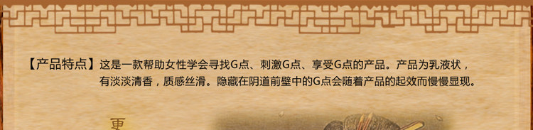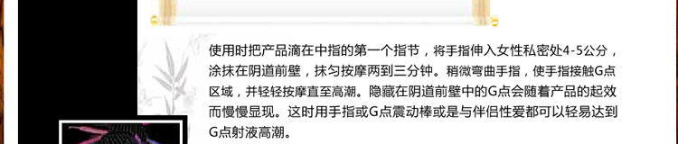 这是一款帮助女性学会寻找G点、刺激G点、享受G点的产品,为乳液状,有淡淡的清香,质感丝滑。使用时把产品滴在中指的第一指节,伸入女性私处,涂抹在阴道前壁,抹匀按摩两到三分钟。隐藏在阴道前壁中的G点会随着产品的起效而慢慢显现。这时用手指或G点震动棒或是与伴侣性爱都可以轻易达到G点射液高潮。 产品的说明书中有介绍G点知识的小册子,教授性爱中可以刺激到G点的体位。找到G点,轻松达到性高潮。 |