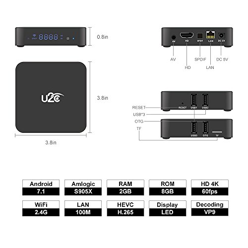 Studio : U2C Publisher : U2C Binding : Electronics Product Description Android tv box Hardware specification: CPU:Amlogic S905X Quad core ARM Cortex-A53@1.5GHz GPU:Penta Core Mali-450? 750MHz RAM:2G DDRIII ROM:8G? eMMC DC In:DC 5V/2A USB Host:3 High speed USB 2.0 port and 1 OTG port,support U disk and USB HDD TF Card Reader:Maximum Support: 128G(Micro SD Card) Lan:100M RJ-45 Wifi:802.11 b/g/n? 2.4G WiFi AV In:AV(3 in 1) port SPDIF:Optical SPDIF interface Power Indicator:Power On/Off:Blue/Red LED Display:White light digital display,Show time and device connecting information(Wifi,Lan,AV,HD,SPDIF) Software information: O.S.:Android 7.1 Decoder Formats:4K, H.265, MPEG1/2/4, H.264, HD AVC/VC-1, RM/RMVB, Xvid/DivX3/4/5/6, Real Video 8/9/10 Video Formats:4K@60fps, H.265, AVI, H.264, VC-1, MPEG-2, MPEG-4, DIVD/DIVX, Real8/9/10, RM,RMVB, PMP, FLV, MP4, M4V, VOB, WMV, 3GP, MKV Music Format:MP1, MP2, MP3, WMA, OGG, AAC, M4A, FLAC, APE, AMR, RA, WAV Photo Format:JPEG/BMP/GIF/PNG/TIFF Languages:English/French/German/Spanish/Italian etc. 24 languages Mouse/ Keyboard:Support mouse and keyboard via USB;Support 2.4GHz wireless mouse and keyboard via 2.4GHz USB dongle. Other feature:Free Internet searching,many kinds of games,etc. What You Get: U2C X Pro TV Box US plug 5V/2A Power Adapter Learning Remote Control (AAA Batteries Sold Separately) HD Cable English User Manual