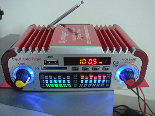 -. Feature : With FM radio function, digital display. / Imported high-quality power amplifier IC, hafiz sound quality. / 12 V power supply for car and motorcycle, colorful dynamic LED level display. / Treble bass volume independent Regulator with remote control , more convenient. / With USB / SD interface, can play MP3 Audio files directly , external high quality RCA inputs for connecting CD / DVD or computer and other sources.