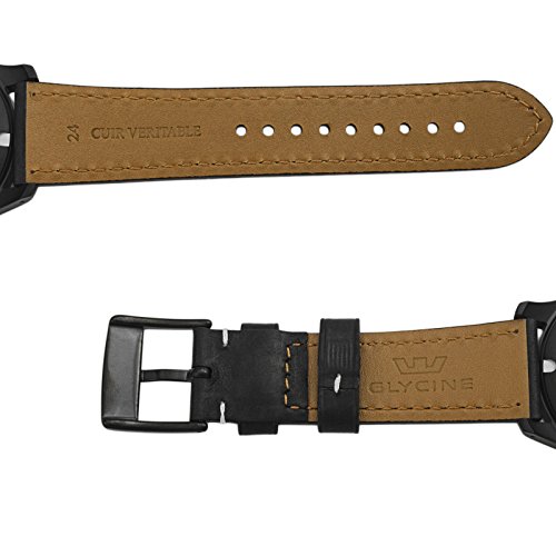 -. Feature : Scratch resistant Sapphire / Ruthenium coated oscillating weight on ball bearing decorated special Glycine engraving / Black Genuine leather / Automatic self-winding movement, Caliber: GL 224, 25 Jewels / See-Through case back, Screw down