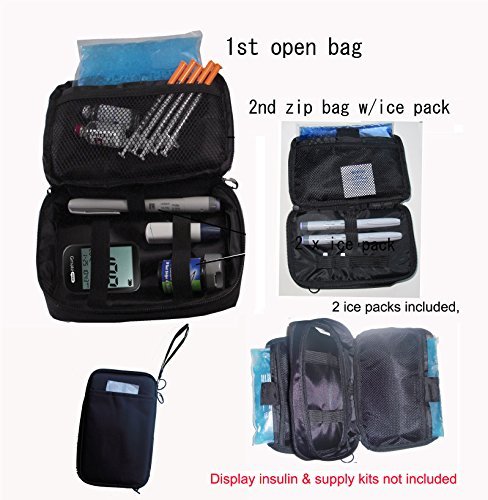 -. Feature : Double Thick Insulated cooler bag-For Insulin Pen, Syringes & Supplies kits organizer / Bag Size:8.25" x5. "x1.5", Ice Gel Pack Included,Supply kits are not include / Cooler Bag Keep Insulin cool when you outing , traveling, working or sporting. / Cooling,Cold, Organizer, Individual, Portable, Stylish, insulin, Diabetes testing paper & kits, Meter / The bag is just the right size for holding meter, test strips, lancing device, pens ,, some syringes, needle tips, glucose tablets and alcohol pads etc..Long Lasting ,Keep cool last 5-6 hours or more.