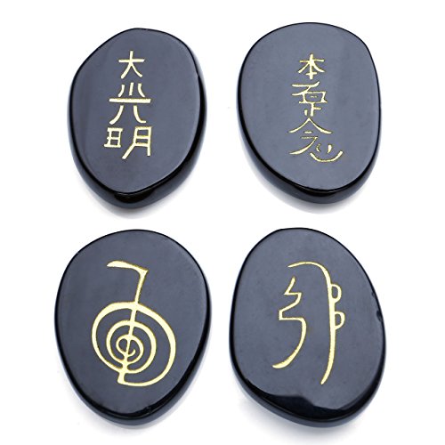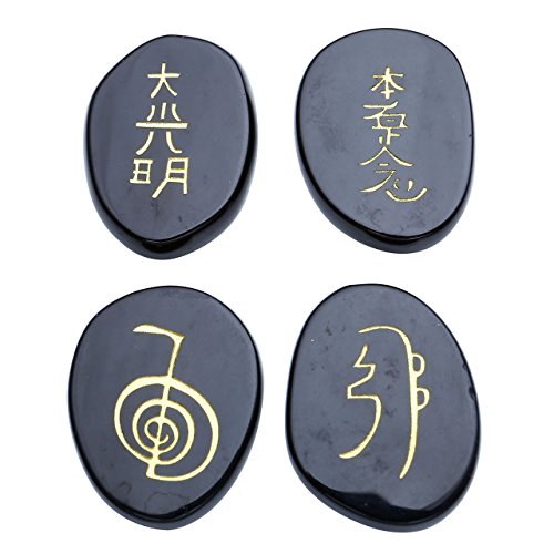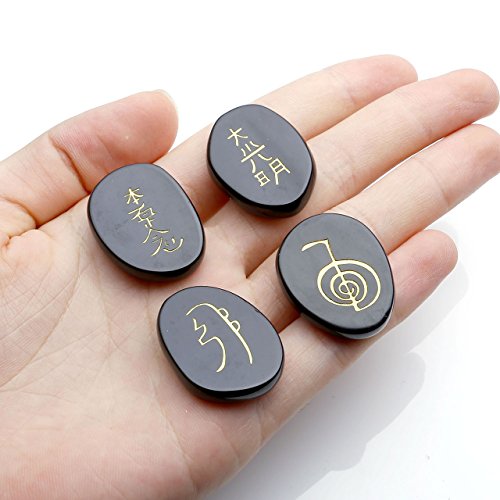 JOVIVI Healing Crystals - 4pcs Engraved Usui Reiki Symbols Chakra Stones Healing Palm Stone (Black Agate Stone)