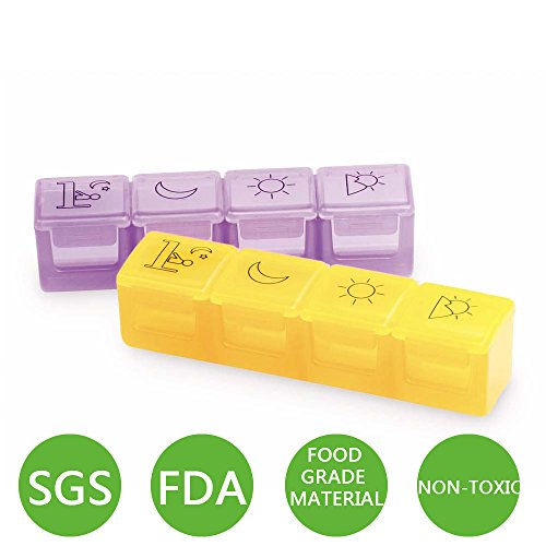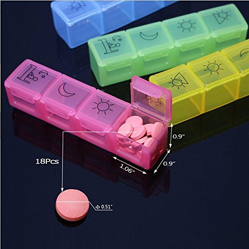 1.Detachable pill case:Portable for carrying around when traveling 2.Divided into 28 Small boxes, 7 days 4 times per day (morning, afternoon,evening and bed) 3.Great holder for mints, vitamins, pills, CLA and fish oil tabletsor other small units 4.Stickers are provided to label for 7 days,you can diy it by yourself 5.7-color compartments stand for each day in a week,easy to distinguish different pills 0