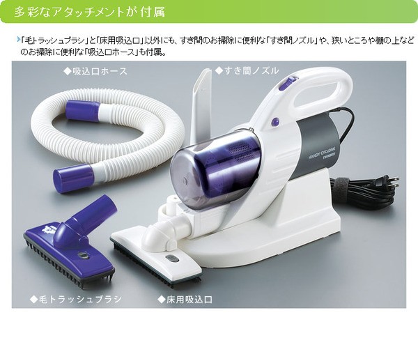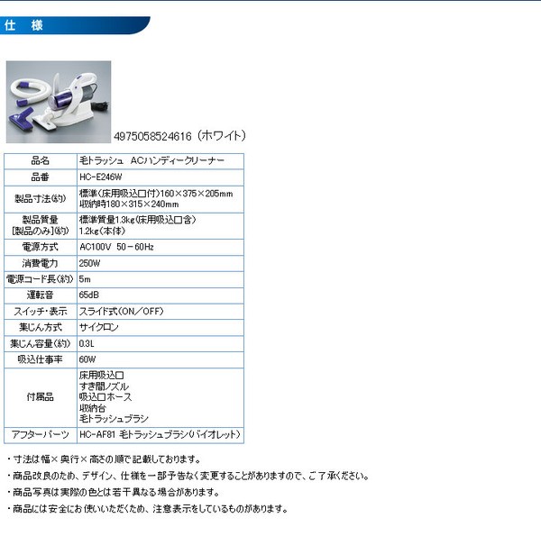 【商品名】 TWINBIRD(ツインバード) 毛トラッシュ ACハンディークリーナー HC-E246W ホワイト  ○ペットの抜け毛をかき取り吸込む毛トラッシュブラシ付属ペットの抜け毛掃除に最適な、毛トラッシュブラシ付属。エラストマー樹脂製のブラシが、カーペットや玄関マット等の繊維の表面に絡みついたペットの毛をかき取り吸込みます。さらに、カーペットや玄関マット等の繊維の奥のゴミやホコリもかきだしてお掃除できます。※毛トラッシュブラシは引きながらご使用ください。(押しては使えません)※毛トラッシュブラシは、フローリング・畳・革製品には使用しないでください。 フローリング・畳・革製品を傷つける原因になります。カーペットや布地のお掃除にご使用ください。※毛トラッシュブラシは消耗品です。 毛が集めにくくなったら交換時期です。 お買い上げの販売店・弊社のお客さまサービス係までお問い合わせください。●アフターパーツ:毛トラッシュブラシ(バイオレット):(HC-AF81)○『高速遠心分離サイクロン(HiCYCS)』方式採用サイクロンの高速回転とフィルターカバーの働きにより、ゴミと空気を強力に分離。