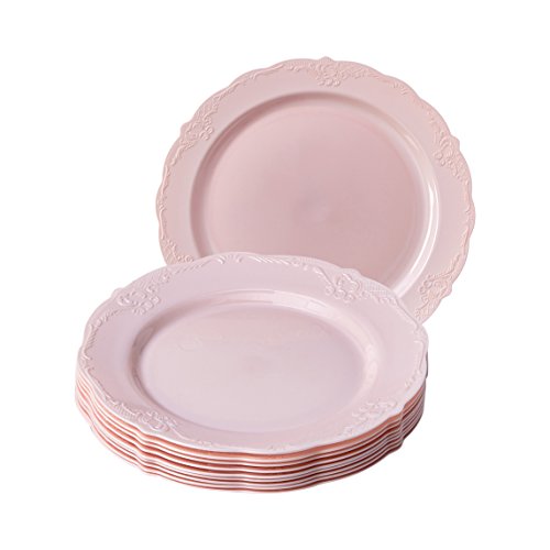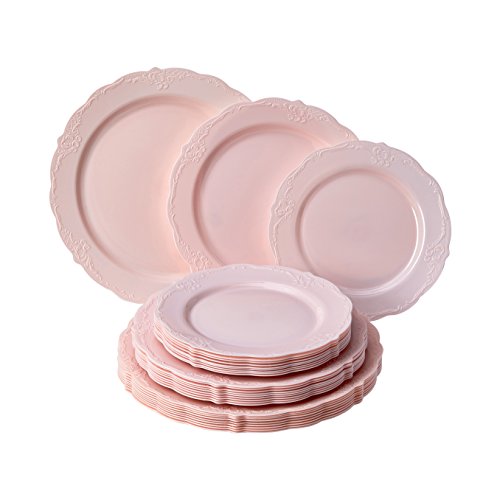 - PREMIUM GRADE MATERIAL: The Vintage collection is Eco-disposable and is made from the finest compostable plastic material. The set includes 10X 10.25” diameter dinner plate, 10X 9” diameter salad plates, and 10X 7.5” diameter dessert plates. They are made from top-notch quality, BPA-free plastic material which makes the disposable plates super resistant to bending and makes carrying lots of food items a breeze.
