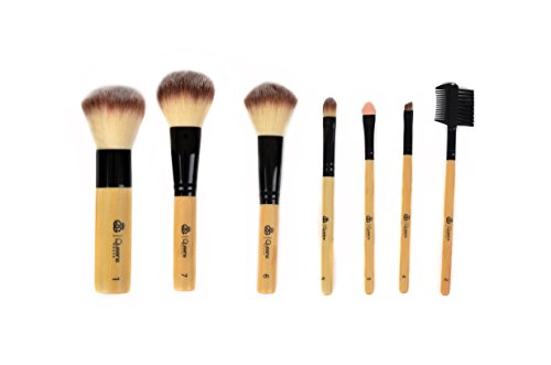 7 Piece Bamboo Makeup Brush Set with Roll-Up Cotton Travel Pouch - Premium Synthetic Hair & Wooden Handles - by Queen's Grace
