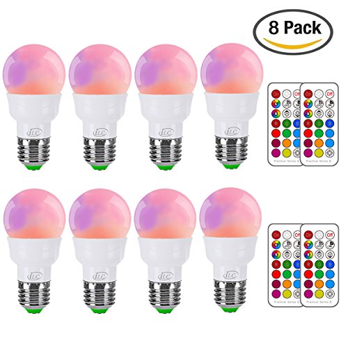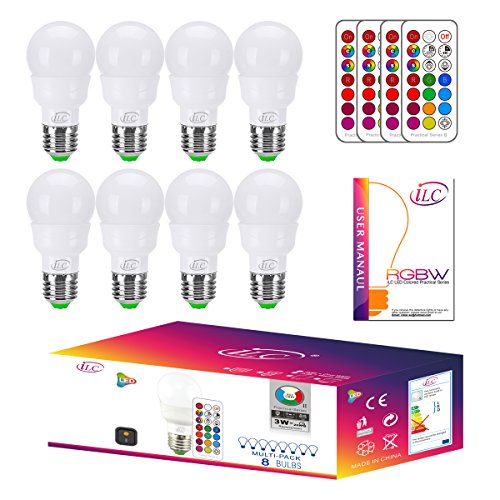 iLC RGB LED Light Bulb, Color Changing Light Bulb Dimmable 3W E26 Screw Base RGBW, Mood Light - Dual Memory - 12 Color Choices - Timing Infrared Remote Control Included (8 Pack)