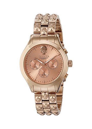 -. Binding : Watch -. Brand : Invicta -. Color : Rose Gold -. Department : womens -. EAN : 0886678214747 -. Feature : Round watch featuring numberless rose gold-tone dial with embossed skull at 12 o'clock, luminous hands, and three subdials / 40 mm rose gold-tone stainless steel case with synthetic-sapphire dial window / Swiss quartz movement with analog display / Rose gold-tone bracelets with embossed skulls on links and fold-over clasp with safety closure / Water resistant to 50 m (165 ft): In general, suitable for short periods of recreational swimming, but not diving or snorkeling -. IsAdultProduct : 0 -. Label : Invicta -. Manufacturer : Invicta -. Model : 16940 -. MPN : 16940 -. PackageQuantity : 1 -. PartNumber : 16940 -. ProductGroup : Watch -. ProductTypeName : WATCH -. Publisher : Invicta -. Studio : Invicta -. Title : Invicta Women's 16940 Angel Analog Display Swiss Quartz Rose Gold Watch -. UPC : 886678214747
