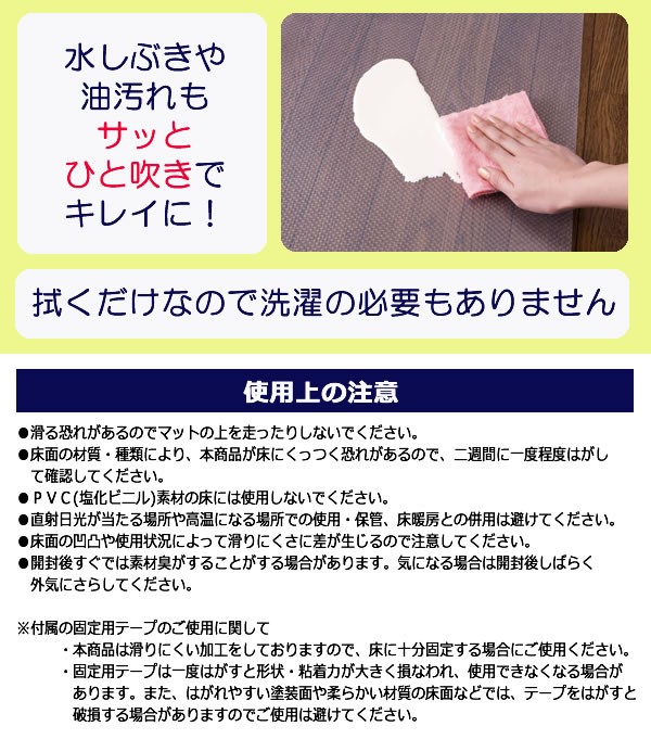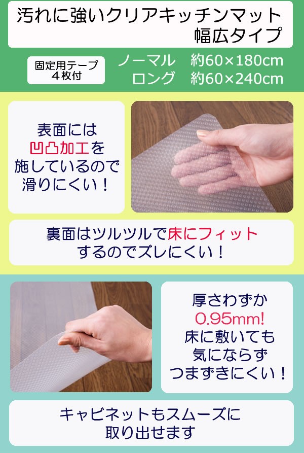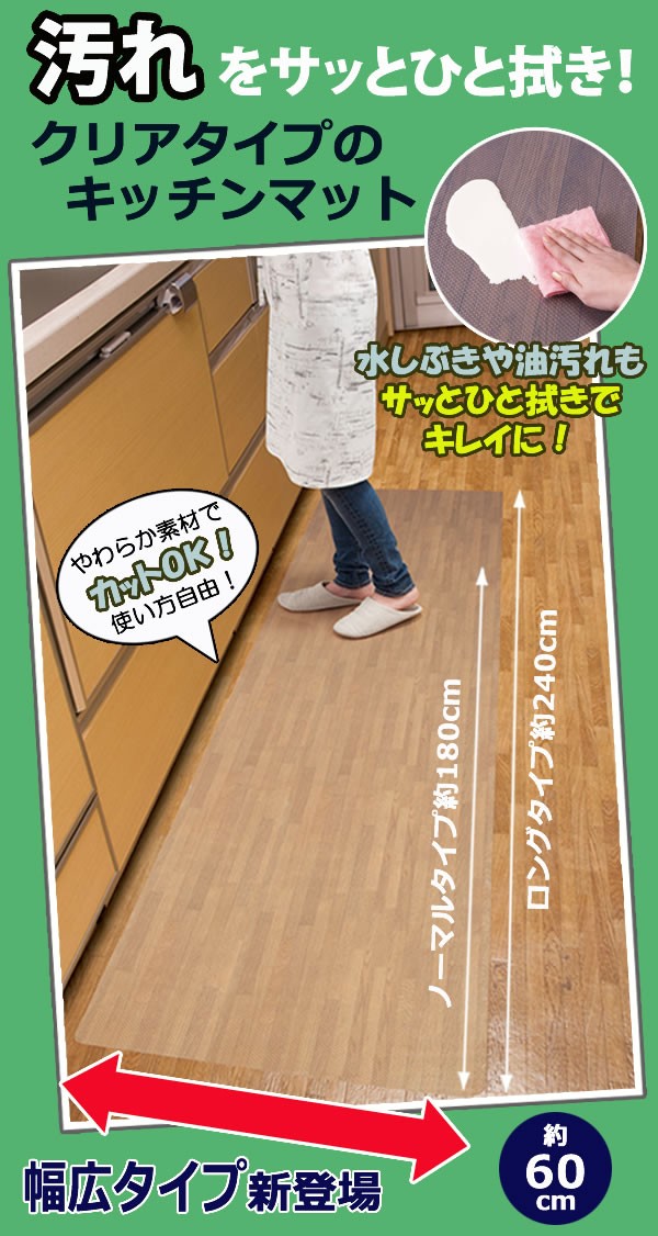 | <h1>汚れに強いクリアキッチンマットに幅広タイプが新登場!汚れたらサッと拭くだけで簡単キレイ!洗濯する必要がありません。表面は凹凸で滑りにくく、裏面はずれにくく床にフィット!クリアタイプなのでどんなキッチンにもピッタリ。やわらか素材でカットもできるクリアキッチンマットです。</h1> |