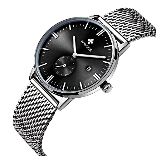 -. Title : WWOOR Genuine Brand Quartz Steel Mesh Belt Men 's Watch Black Dial Calendar Display Simple Fashion Watch