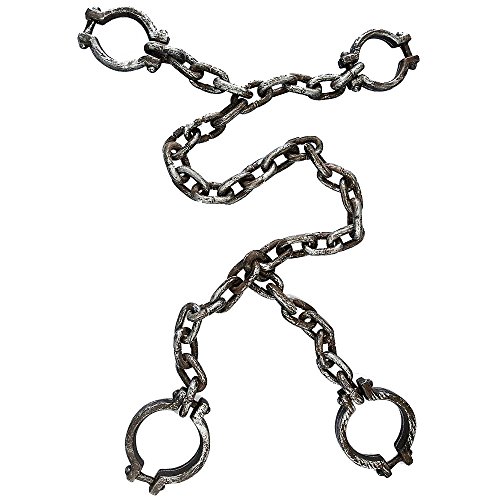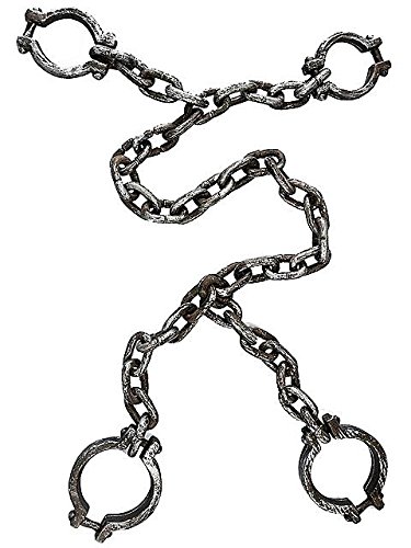 -. Feature : Lightweight shackles for hands and legs. / Metallic look but made of plastic. / Gross Weight: 1.25 lbs. / 50 inch length chain.