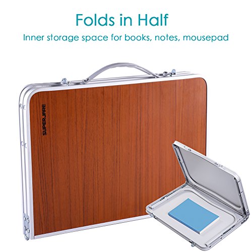 -. Feature : MULTIFUNCTIONAL FOLDABLE TABLE - Use it as a laptop desk for bed/couch for a relaxing workspace, as a standing desk at office if you get tired of sitting, as a writing/drawing desk for a spacious space, or book/tablet stand, or as a breakfast serving tray in bed for lazy mornings- It will certainly satisfy you! / SPACIOUS ROOM - Unfolded size: 23 1/8"L x 16 3/16"W x 10 1/8"H (Perfectly fits a 16" laptop with extra mouse space); Folded Size: 16 1/8"L X 11 9/16"W x 1 9/16"H (An inner room for store a book/mouse pad) / LIGHTWEIGHT AND PORTABLE - The table folds down easily to 1/2, it is really compact and lightweight. And has locking clasps and a handle to make it portable for the beach, travel, camping purposes / STURDY ENOUGH - Sturdy aluminum alloy frame with supporting buckle, non-slip design on the bottom. Max load: 66 lbs (30 kg) / TIPS BEFORE BUYING - The bed tray is featured in folds in half, there is no locking mechanism for the center when opened. If you want to lift or move the table, please move from two sides instead of the middle place