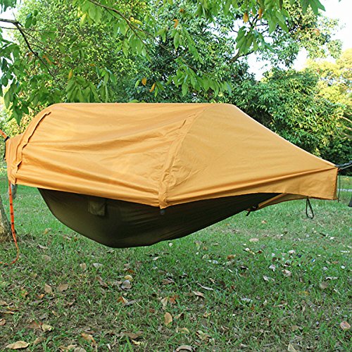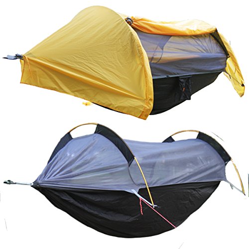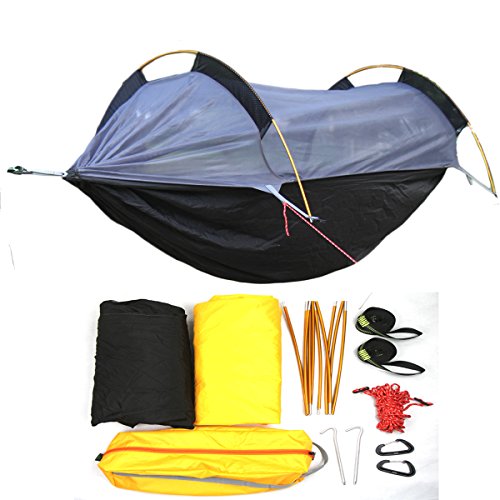 1.Package: 1* hammock with bug net which keep you away from insects;1*waterproof hammock cover which keep you dry when rains and fog-water;2*tree straps with nopes which helping set up easily and protecting trees;2*foldable metal poles to stand up the net ;2*ropes and 2*stakes to prevent the hammock turn over;4*Carabiners,2 for hammock and 2 for the rain fly cover;1*zipper carrying bag