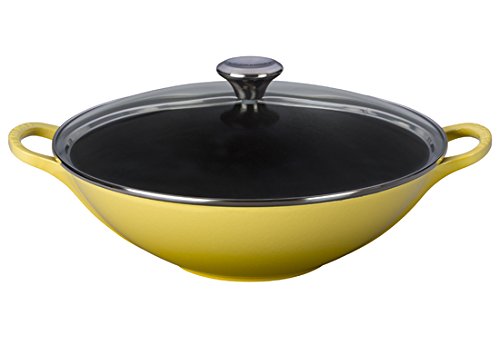 A staple of east Asian cuisine for centuries, woks are perfect for not only stir-frying, but also braising, steaming and stewing. This beautiful wok pairs the traditional curved sides with a flat base that ensures solid contact with any stovetop heat source. A tempered-glass lid locks in moisture while steaming and makes it easy to keep an eye on cooking foods. Constructed from le Creuset's legendary enameled cast iron, this wok is as beautiful to look at as it is to cook with.Feature