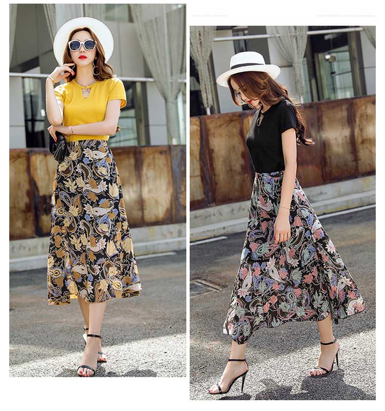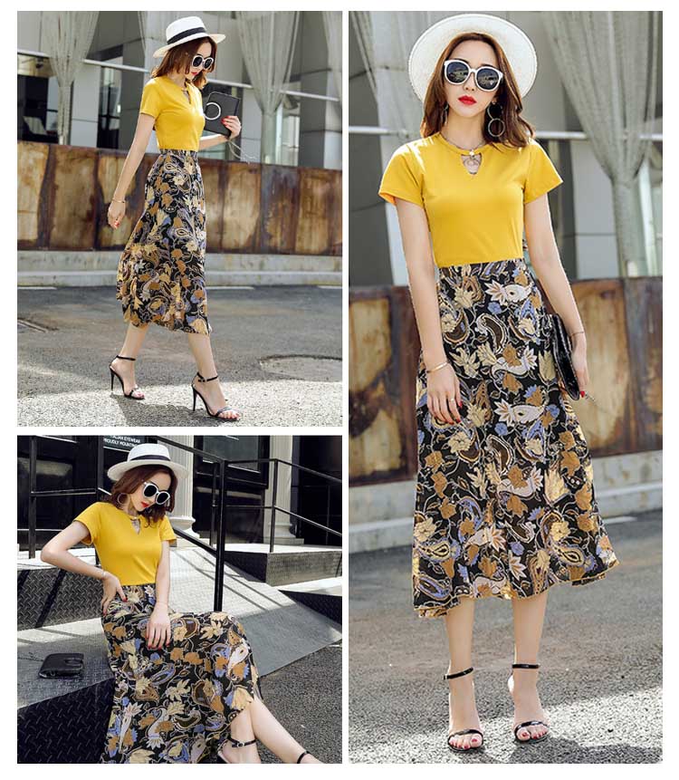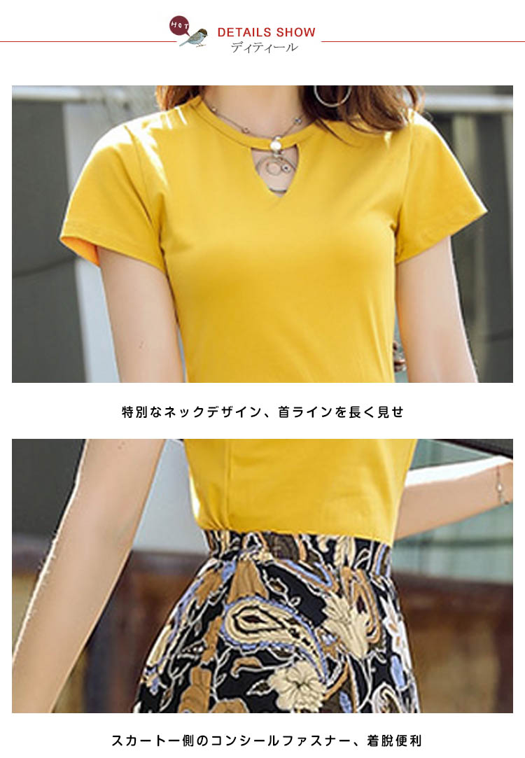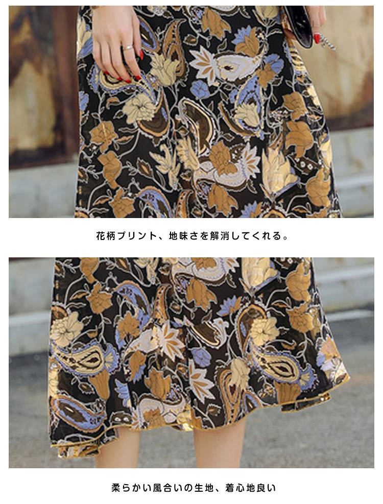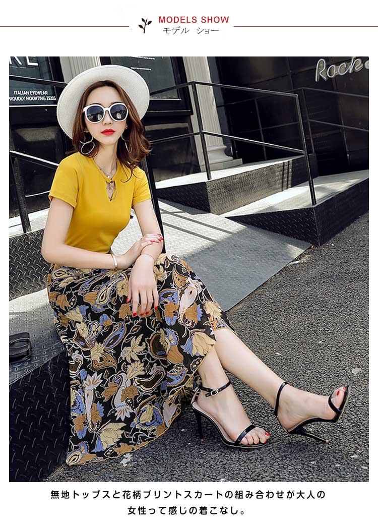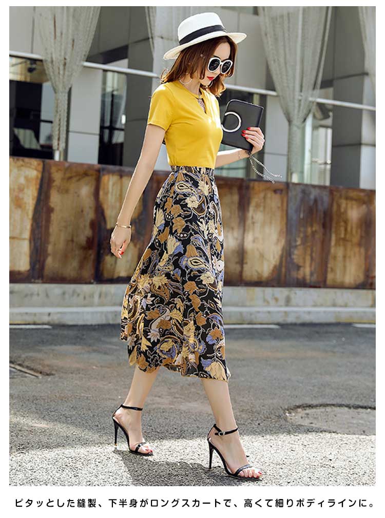 | コーデの面倒を省ける便利のセットアップ。無地トップスと花柄プリントスカートの組み合わせが大人の女性って感じの着こなし。ピタッとした縫製、下半身がロングスカートで、高くて細りボディラインに。スカートはシフォン生地とアシンメトリーデザインで、足元に軽さが出て女性らしい雰囲気も出る。 | |